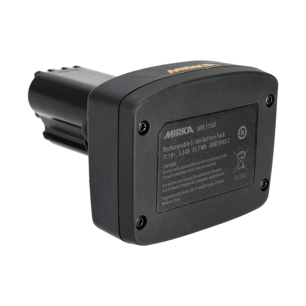 La batería inteligente de iones de litio Mirka® permite una medición precisa de la capacidad mediante un contador de culombios. Al conectar la herramienta a la aplicación MyMirka, puede supervisar fácilmente la carga, el estado de la batería y el número de ciclos de carga, lo que permite prolongar la vida útil y el tiempo de uso. La batería de 11,1 V y 5,0 Ah tiene 6 celdas y el tiempo de carga es de aproximadamente 1 h 30 min.