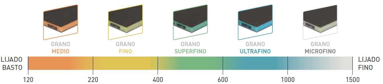 | Grano | Medio 120-220 Naranja, Fino 220-400 Amarillo, Superfino 400-600 Verde, Ultrafino 600-1000 Azul, Microfino 1000-1500 Blanco |