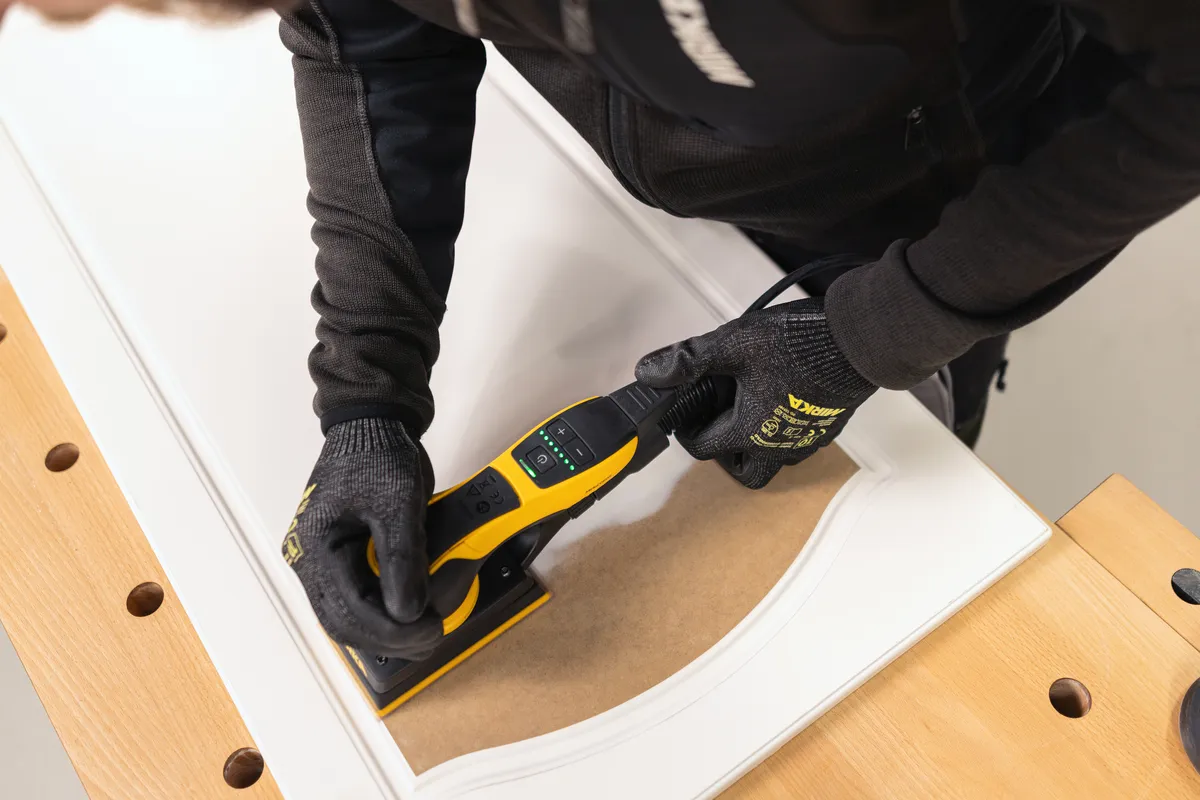 Mirka DEOS II 353 es una lijadora orbital eléctrica ideal para trabajos en madera y pintura decorativa. Perfecta para puertas y ventanas, pero también para esquinas, bordes, superficies de trabajo de difícil acceso y espacios reducidos.