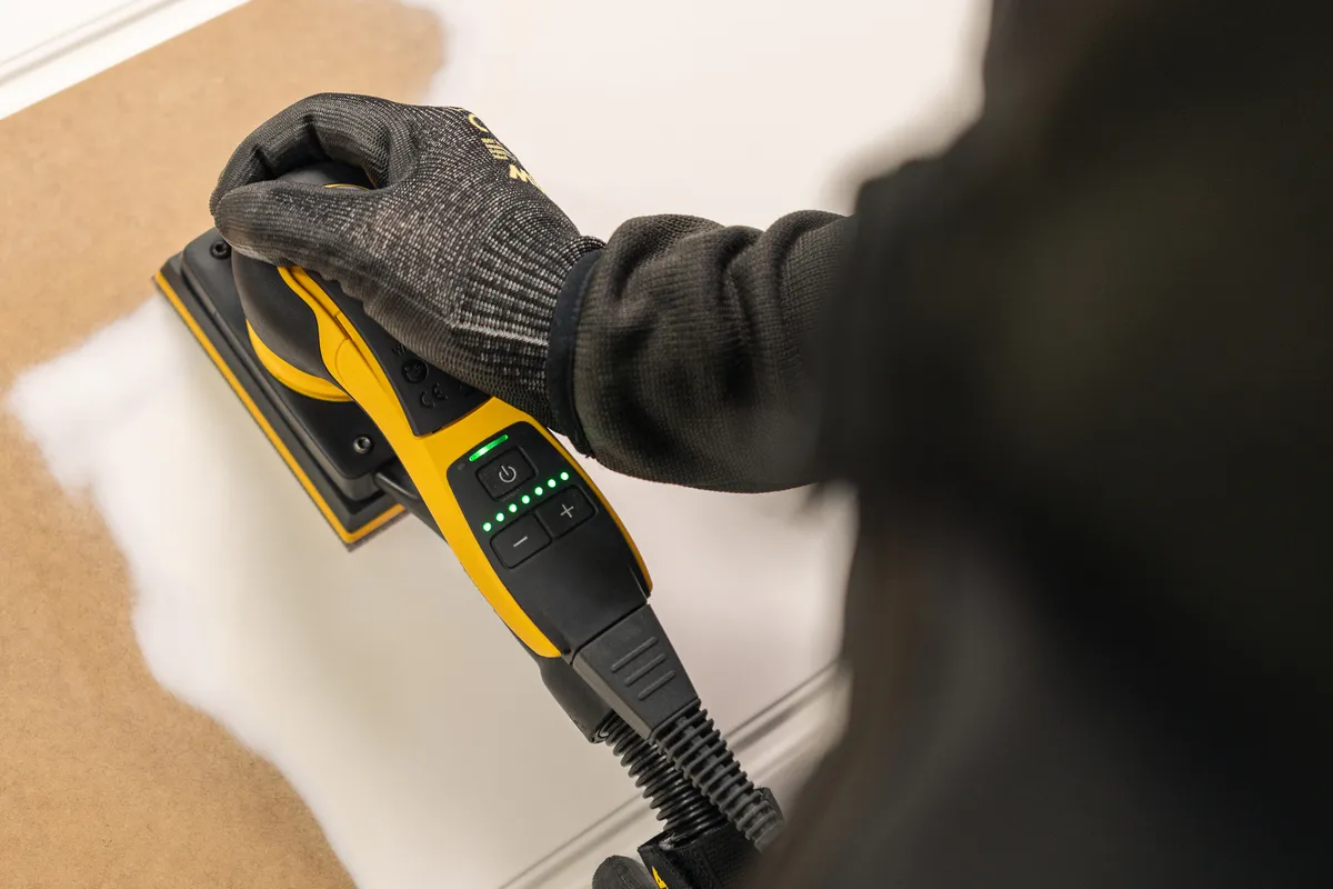 Con sólo 10 cm de altura, el perfil compacto y muy bajo de la herramienta proporciona una gran maniobrabilidad y ayuda a ofrecer un rendimiento de lijado preciso y eficiente. El diseño ergonómico, las bajas vibraciones y el bajo nivel de ruido garantizan que la lijadora pueda utilizarse cómodamente durante largos periodos sin fatiga. El operario puede ajustar fácilmente la velocidad de lijado: además de la palanca de fácil manejo, Mirka DEOS II también cuenta con indicadores LED claramente visibles para el selector de velocidad y un interruptor de encendido/apagado independiente. El motor sin escobillas de larga duración y alta eficiencia de Mirka DEOS II mantiene una velocidad constante y puede afrontar sin esfuerzo los trabajos de lijado más exigentes.