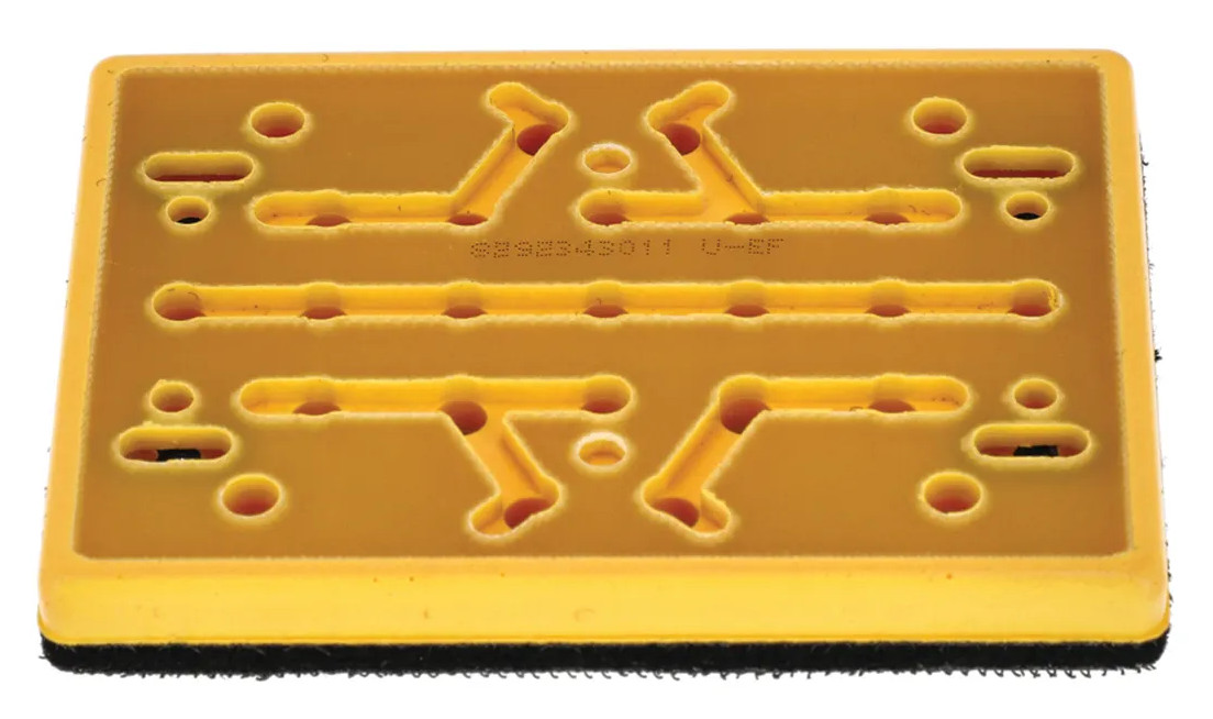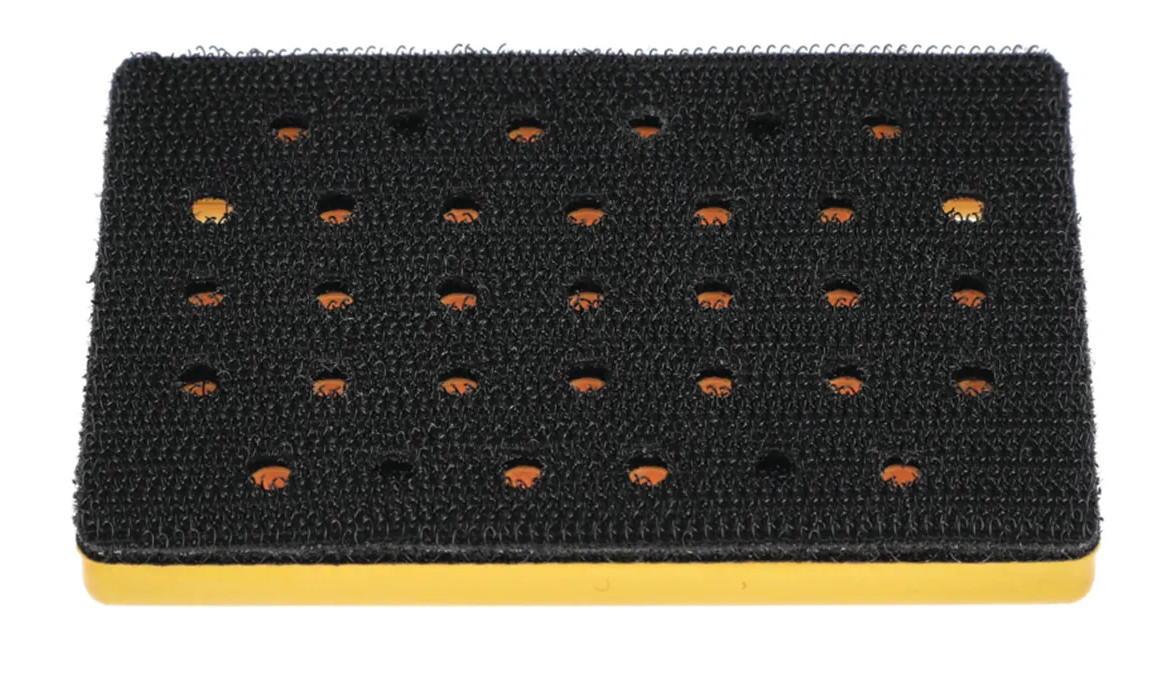 Plato de 75 x 100 x 8 mm, con 29 agujeros para la aspiración del polvo, específico para la lijadora orbital eléctrica MIRKA DEOS 343 y DEOS II 343. Fijación de la lija mediante velcro y dureza media.